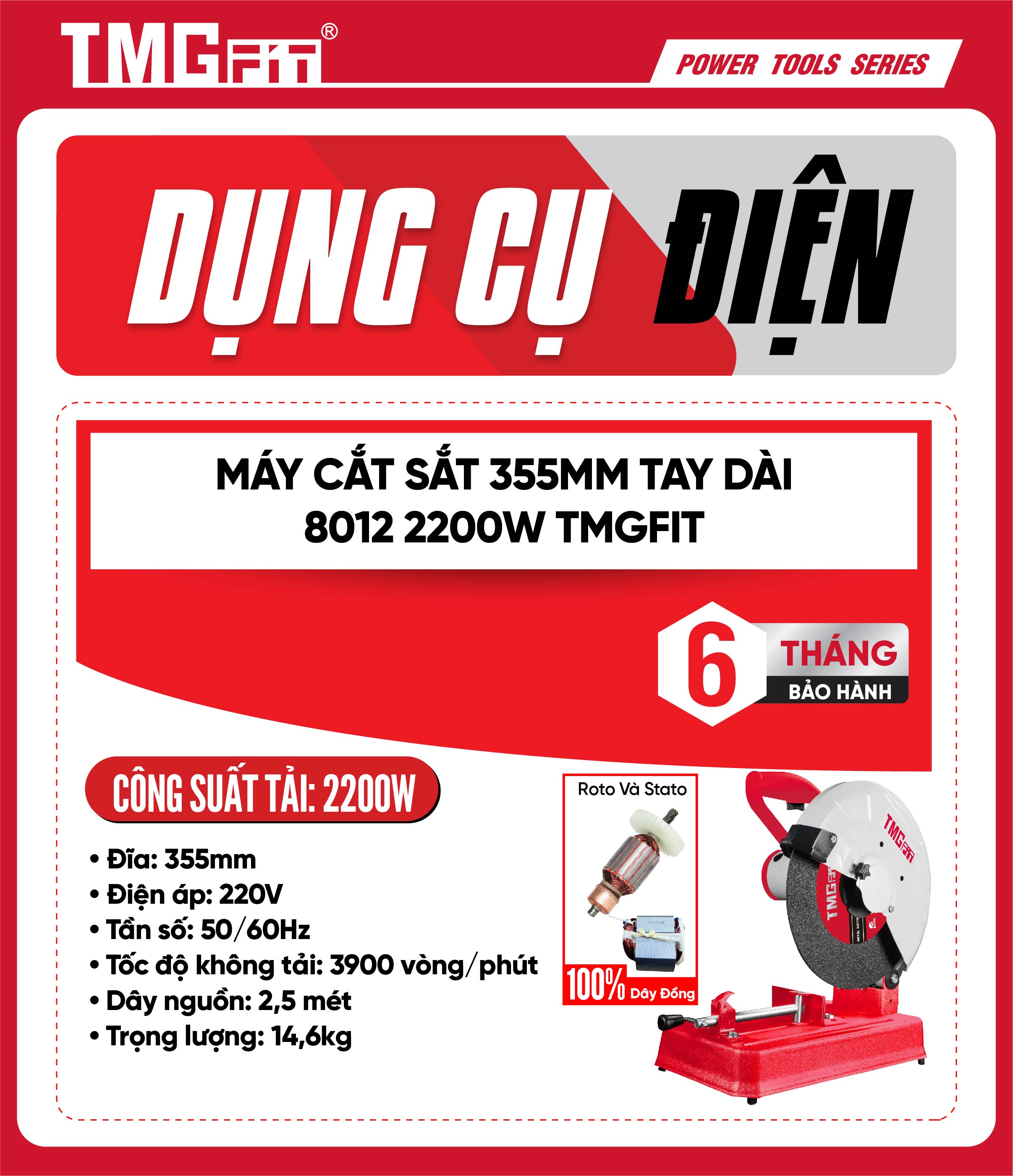 Tiêu chuẩn kỹ thuật: Sử dụng 100% dây đồng cho bộ phận Roto và Stato đối với các dòng máy cắt, đảm bảo độ bền và khả năng chịu tải cực cao.