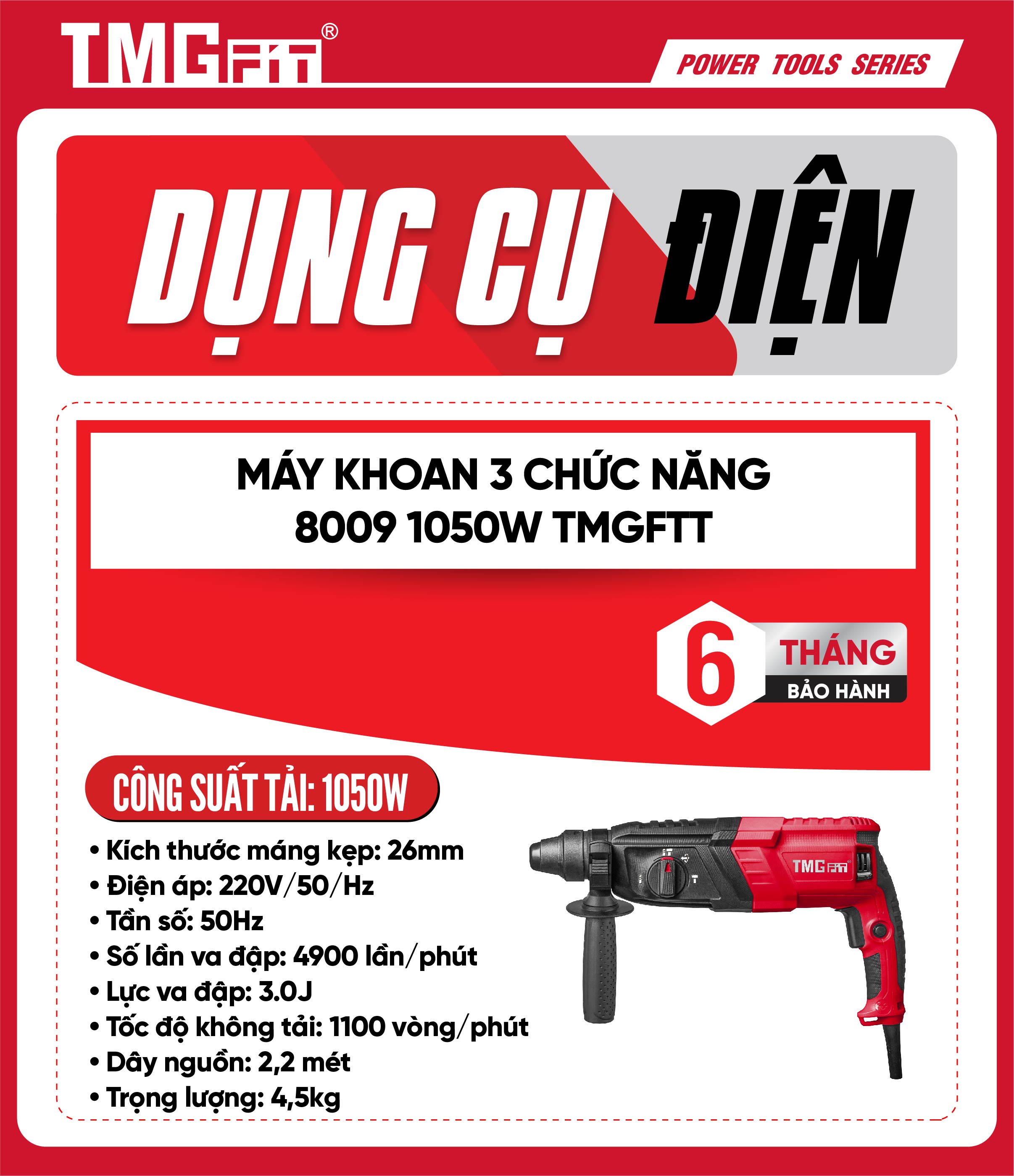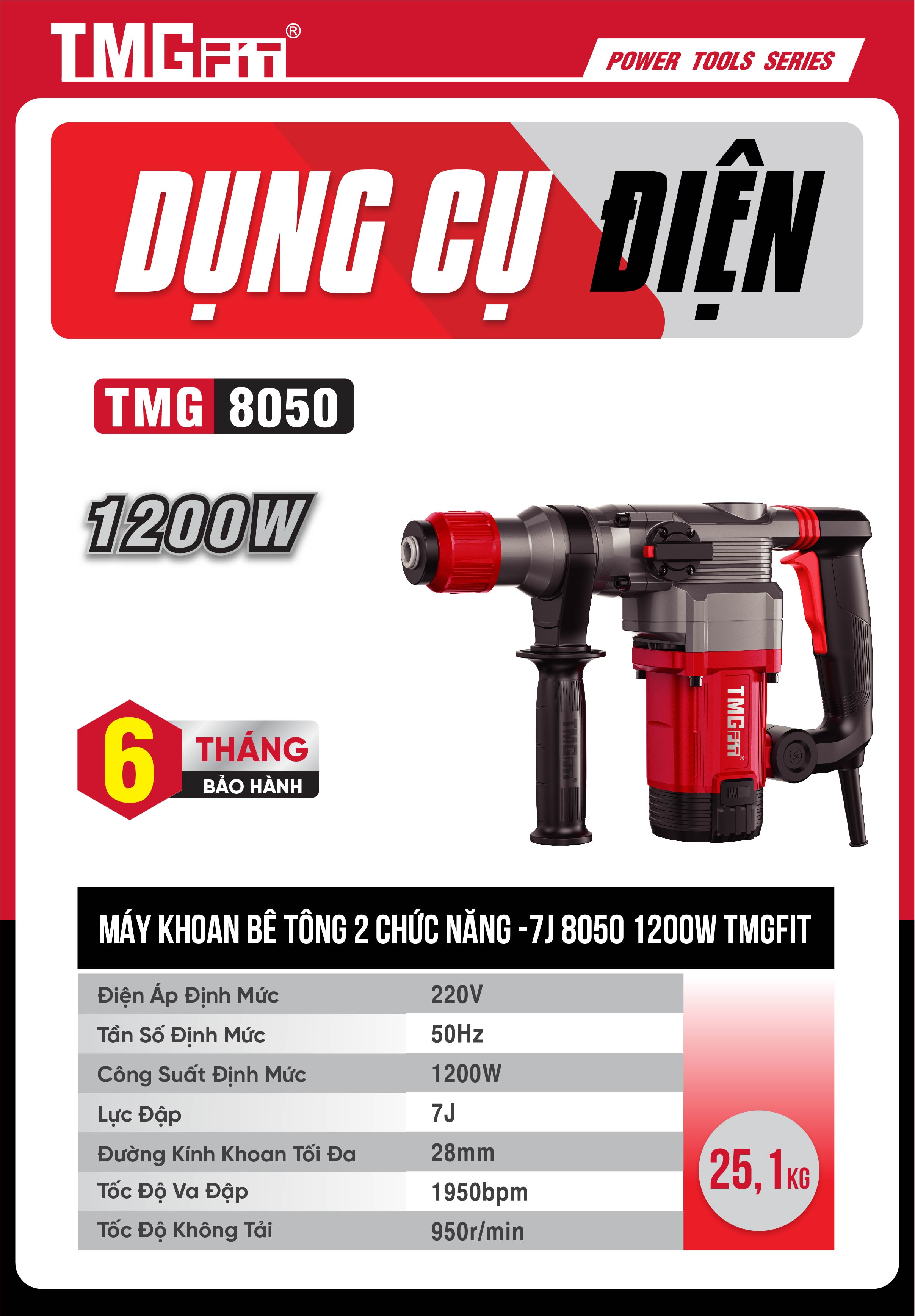 Là dòng máy khoan động lực mạnh mẽ 2 chức năng đục và khoan, Máy khoan búa 2 Chức Năng 28mm 1200W 8050 TMG FIT, thuộc phân khúc máy công trình với công suất lớn lên đến 1200W. Sản phẩm có thiết kế hầm hố với tông màu đỏ đen đặc trưng, tay cầm phụ chắc chắn giúp giảm rung lắc và tăng độ chính xác khi thi công.