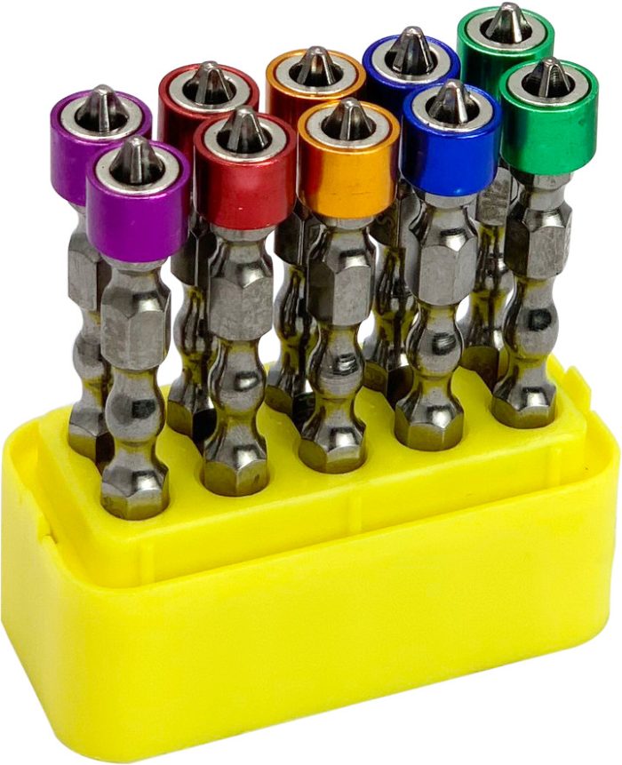 - Mũi vít 65 mm_ Đầu nam châm: Chuẩn PH2, thép S2, lực hút mạnh, độ cứng 58–62 HRC. Bộ 10 mũi nhiều màu, phù hợp thi công liên tục, dễ phân biệt khi dùng.